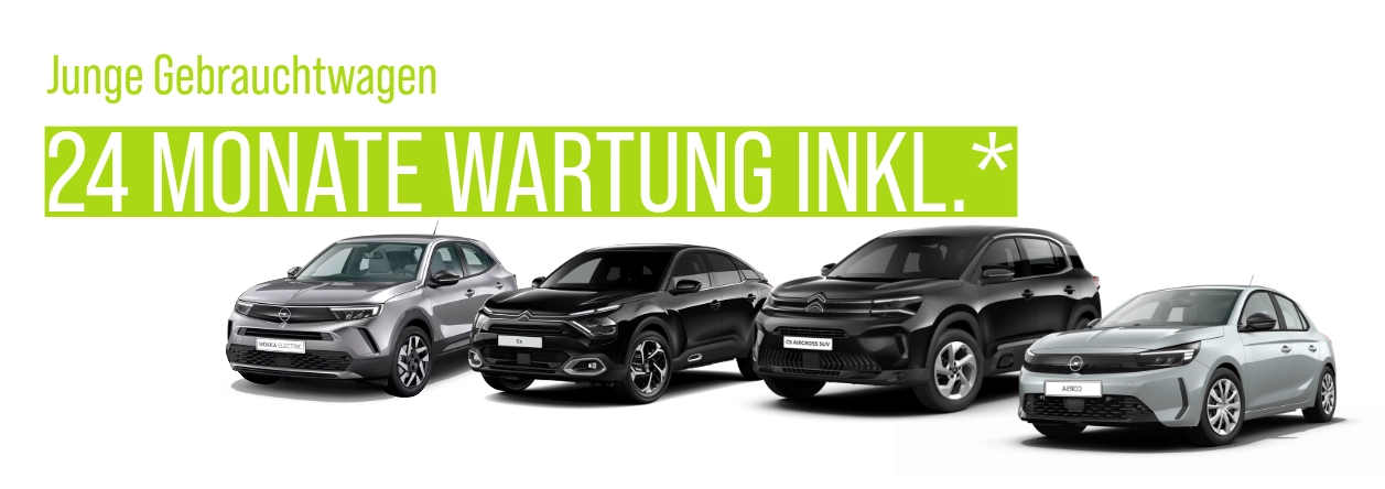 Die Aktion „24 Monate Wartung inklusive“ gilt für ausgewählte, gekennzeichnete Gebrauchtfahrzeuge bei Kaufvertragsabschluss im Aktionszeitraum 01.03.2026 – 31.12.2026.
